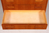 Elegante Mid-Century Kommode aus massivem Teakholz mit charaktervollem Design der 1960er und 1970er Jahre. Diese Vertiko besticht durch ihre zeitlose Formensprache und hochwertige Handwerkskunst – ein Klassiker, der jeden Raum aufwertet. Die geräumigen Schubladen bieten praktischen Stauraum, während die warme Holzmaserung und die schlichte Eleganz des Teaks zeitlose Schönheit ausstrahlen. Ein authentisches Stück Vintage-Möbeldesign für Sammler und Liebhaber von klassischem Interieur.