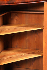 This exquisite Biedermeier corner cabinet in mahogany captivates with its elegant vertico form and authentic craftsmanship from the mid-19th century. The fine wood displays the characteristic patina and grain that only genuine antiques offer. With its thoughtful use of space and timeless aesthetic, this piece will be a focal point in any classically furnished interior. An investment in history and quality that will last for generations.